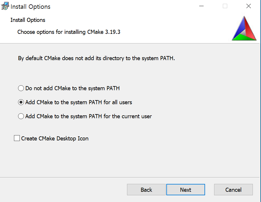 3) 'Add CMake to the system PATH for all users' Check, Next -> 4) Next -> 5) Install