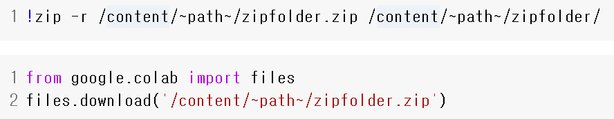 두 번째 구간에서 "/content/path/zip하고자하는폴더/"는 압축(zip)할 폴더 경로를 적는 것입니다.