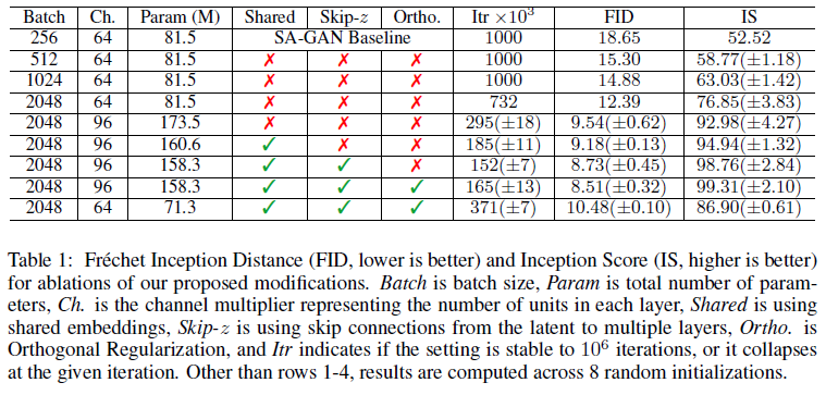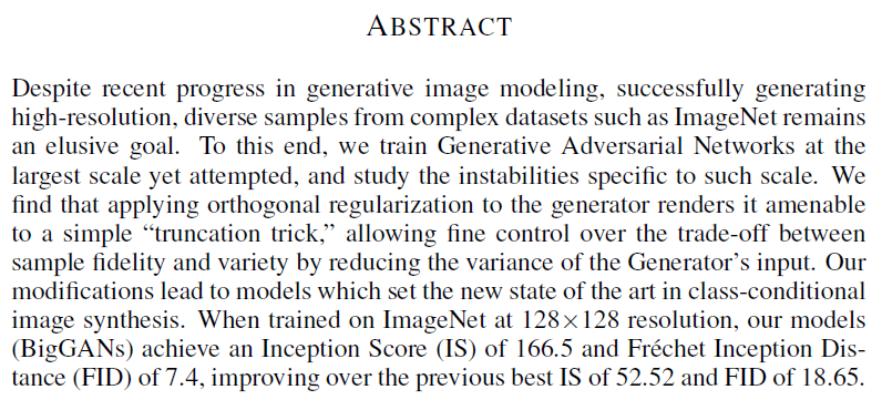 생성 이미지 모델에서 최근의 발전은 성공적으로 고해상도를 생성할 수 있음에도 불구하고 , ImageNet과 같은 복잡한 데이터 세트들에서의 다양한 샘플은 여전히 달성하기 어려운 목표로 남아 있다. 이를 위해, 우리는 지금까지 시도된 큰 규모의 GAN 모델을 훈련하고 큰 크기에 특화된 불안정성을 연구했다. 우리는 generator에 직교 정규화를 적용함으로써 간단한 "truncation trick"을 수정가능하게 한다는 것을 발견했다. 이 기법은 Generator의 입력의 분산을 감소시킴으로써 샘플의 높은 신뢰도와 다양성을 trade-off할 수 있도록 미세한 조정이 가능하게 한다. 우리들의 수정안은 class 조건부 이미지 합성에서 최신 결과를 수립할 수 있는 모델로 이끌었다. ImageNet 128x128 해상도를 학습시킬 때, 우리들의 모델 (BigGAN)은 166.5 IS, 7.4 FID를 달성하여 이전 최고 IS 52.52, FID 18.65보다 향상시켰다.