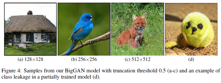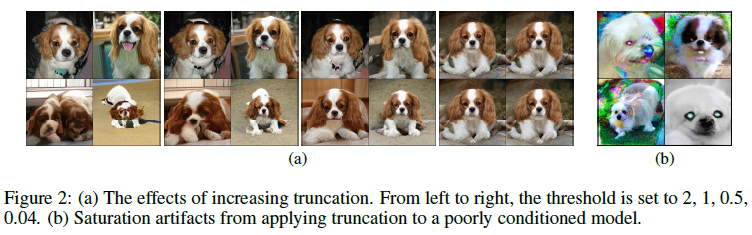 As a side effect of our modifications, our models become amenable to the “truncation trick,” a simple sampling technique that allows explicit, fine-grained control of the tradeoff between sample variety and fidelity.