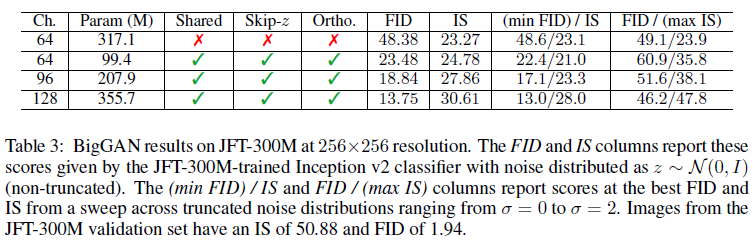 ImageNet은 채널을 늘린다고 해도 어떤 임계점에서는 고정적이지만 JFT-300M을 활용한 실험에서 채널을 늘릴수록 FID, IS가 좋아짐.