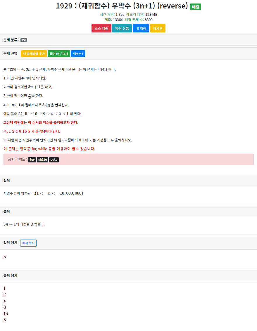 재귀함수를 위한 값들을 설정하고 홀수이면 3*x+1를 실행하고 짝수이면 x//2를 실행한다.