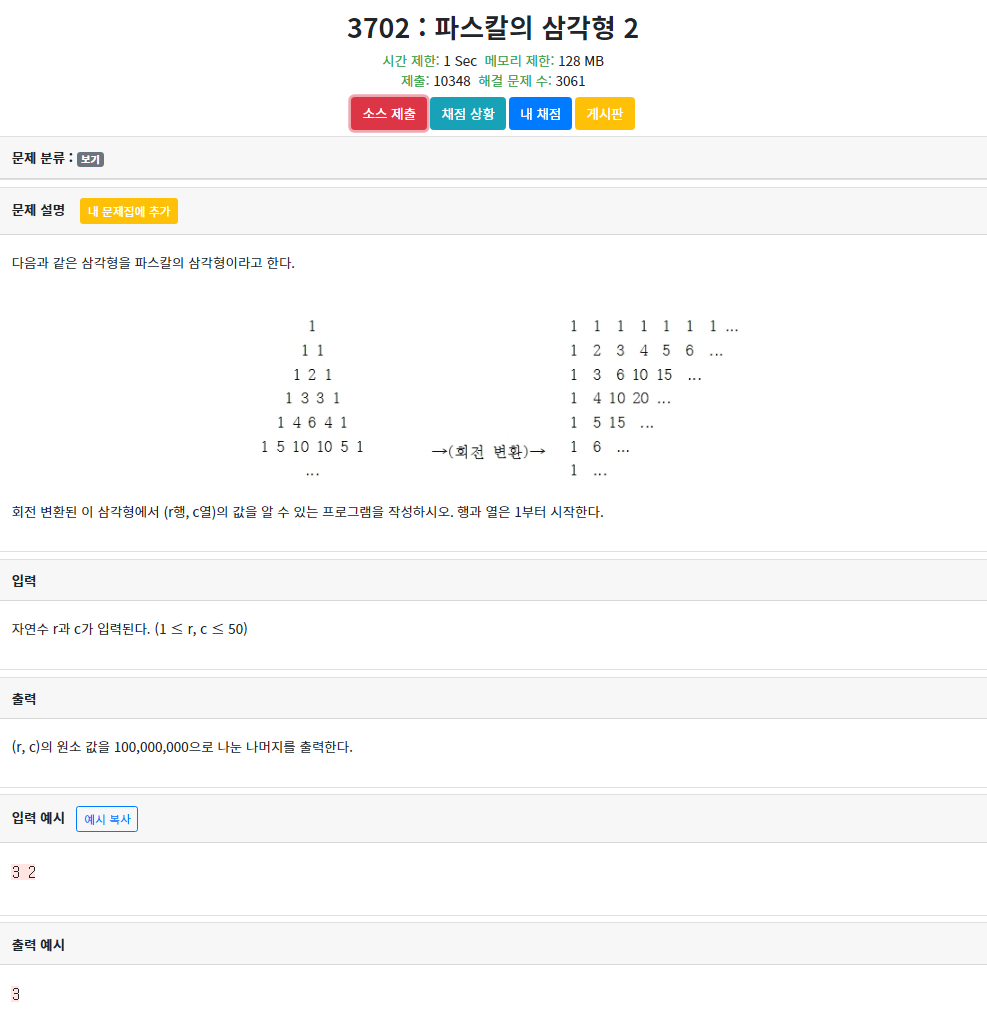 재귀로 돌릴 것은 현재 위치한 row와 column의 상태를 위해서는 row-1와 column의 value와 row와 column-1의 value를 더해야한다는 것에 착안하여 문제를 푸는 것이다.