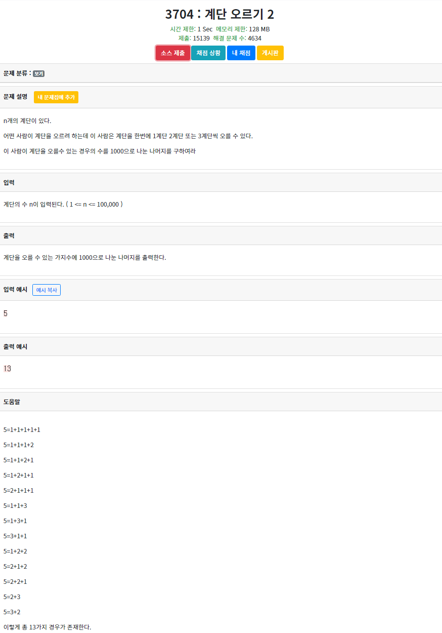 본 문제를 푸는데 중요한 아이디어는 1,2,3 계단 씩 오를 수 있다는 것이다.