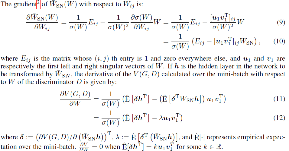 Spectral Normalization을 적용시킨 Weight matrix에 대한 미분을 진행하면 식 (9)와 (10)과 같이 나타낼 수 있다. 이를 V를 기반으로 미분하면 식 (11)과 (12)와 같다. mini-batch로 학습할 경우 다 합쳐서 loss를 업데이터 하기 때문에 Expectation을 사용한다.