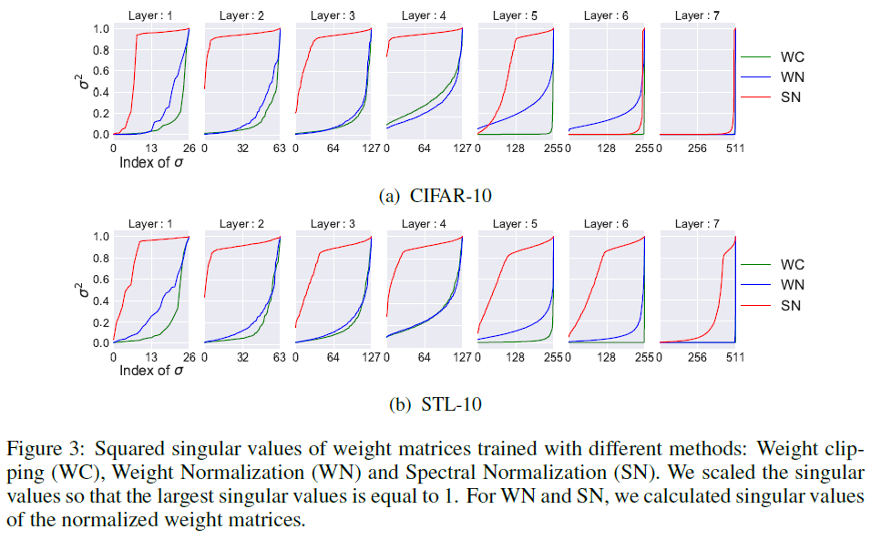 weight normalization은 의도와 달리 행렬에 너무 강한 제약을 줘서 rank가 1이 되게한다. (첫 번째 singular value만 존재하고 나머지는 0) 즉, target으로부터 모델 확률 분포를 오직 하나의 feature만을 가지고 판별한다. weight clipping 역시 비슷한 문제를 가지고 있으나 Spectral normalization은 rank에 독립적이기 때문에 1-Lipschitz constrain을 만족하면서 matrix에 많은 feature들을 사용할 수 있게 한다.