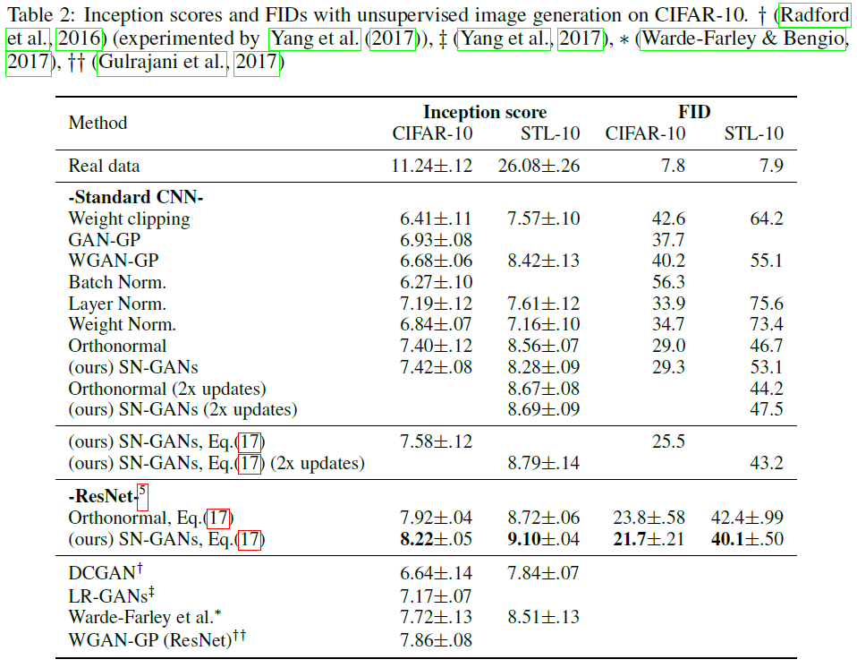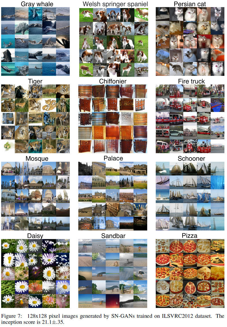 GAN읜 훈련을 안정화시킬 수 있는 spectral normalization을 제안한다. 생성된 이미지는 weight normalization을 적용한 것보다 다양한 이미지를 생성하고 상대적으로 높거나 견줄만한 inception score를 획득한다. discriminaotr에 전역적인 regularization을 내제한다.