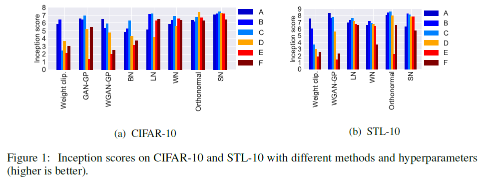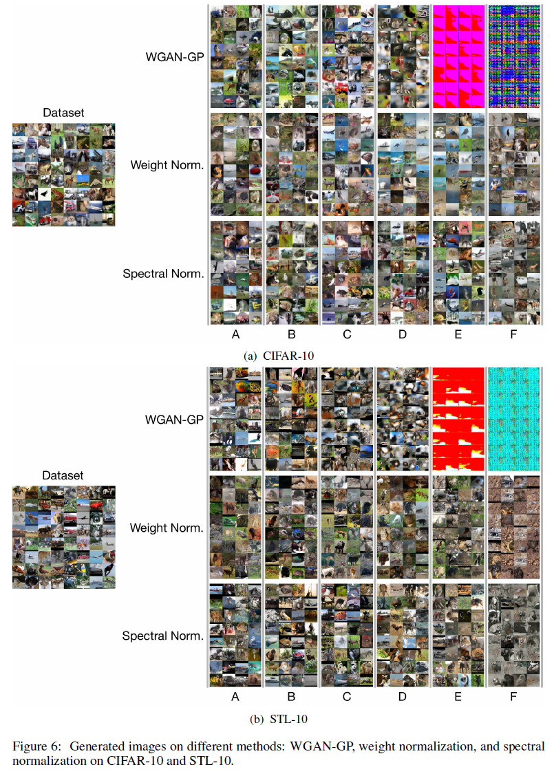 Training Time : Spectral Normalization은 weight normalization보다 약간 느리지만 WGAN-GP보다는 상당히 빠르다.