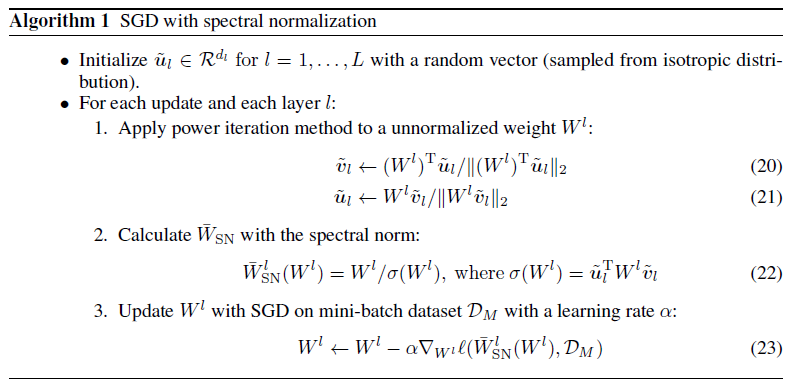 $\sigma(W)$에 대한 계산을 위해 순진하게 singular value decomposition(SVD)를 진행할 시 계산량이 매우 많다. 따라서 power iteration method를 통해 $\sigma(W)$ 추정하는 것이 더 효율적이다. 이와 관련해서는 Appendix A- Algorithm 1을 참조