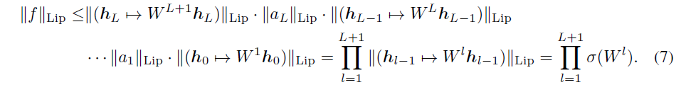 linear layer $g(h)=Wh$라 함은 $\lVert g \rVert_{Lip}= sup_h \sigma (\nabla g(h)) = sup_h \sigma (W)= \sigma(W)$이고 activation fuction의 Lipschitz norm은 1로 설정. Inequality인 $\lVert g_1 \circ g_2 \rVert_{Lip} \le \lVert g_1 \rVert_{Lip} \cdot \lVert g_2 \rVert_{Lip}$에 의거하여 다음과 같은 수식이 나옴.