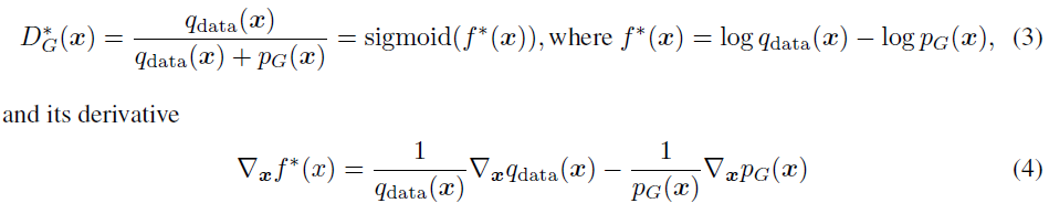 GAN에 있어 최적의 Discriminator는 위와 같이 표현할 수 있으며 그 미분은 Eq (4)와 같다.