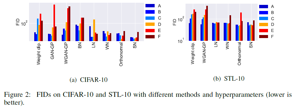 각 모델은 Weight Clipping(WGAN), GAN-GP, WGAN-GP, BN(Batch Normalization), LN(Layer Normalization), WN(Weight Normalization), Orthonormal Regularization 그리고 마지막으로 SN(Spectral Normalization)