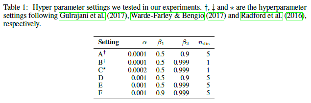 $\alpha$는 learning rate, $\beta_1, \beta_2$는 Adam optimizer의 momentum parameter 1, 2차 계수, $n_{dis}$는 한 번 generator update마다 시행할 discriminator update 횟수를 의미.