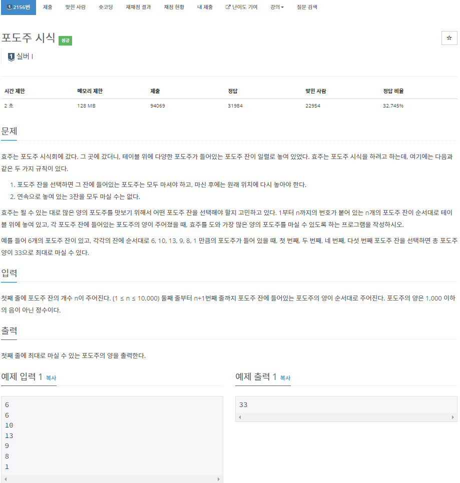 효주는 포도주 시식회에 갔다. 그 곳에 갔더니, 테이블 위에 다양한 포도주가 들어있는 포도주 잔이 일렬로 놓여 있었다. 효주는 포도주 시식을 하려고 하는데, 여기에는 다음과 같은 두 가지 규