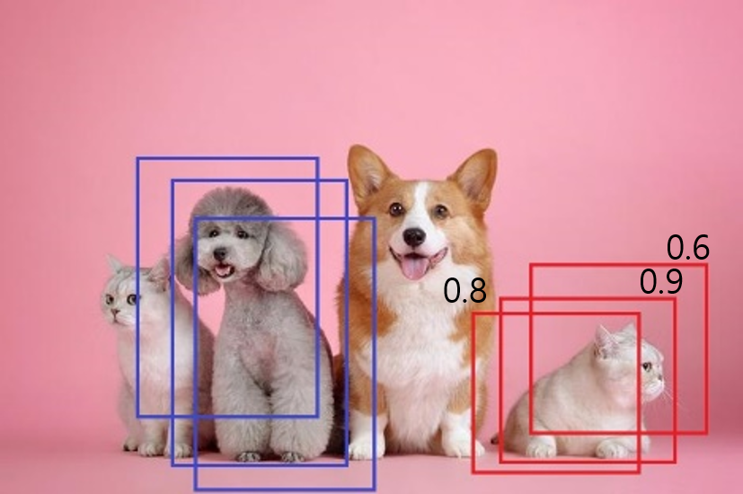 NMS는 각각의 bounding box에 대하여 IoU가 일정 threshold 이상일 때 확률을 비교하는 것으로써 위 이미지에서는 고양이 클래스에 대해 0.9의 확률을 가진 bounding box와 좌측 강아지 클래스 역시 높은 확률의 bounding box만이 살아남을 것이다.