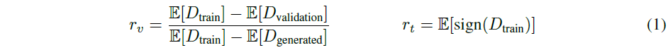 => $r_v$의 경우 $D_{validation}$이 만약 $D_{generated}$에 가깝게 행동한다면 1이 된다. 반면 $D_{train}$에 가깝게 행동하면 0이 된다. 다시 말하면 validation이 generated와 마찬가지로 가짜라고 판단되어 같게 판별된다면 완전한 overfitting이 되고 validation이 train와 같은 분포의 값으로 예측되어 이와 같이 판단된다면 overfitting없이 훈련이 잘 된다고 판별한다.
