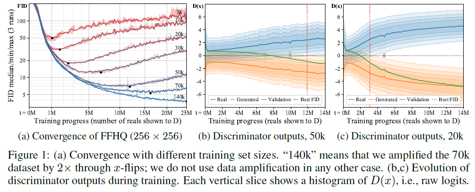 Figure 1. (a) 데이터세트의 데이터 양에 따라 FID 수치를 나타낸 것으로 데이터의 양이 적을 수록 가장 낮은 FID 수치가 빠르게 온다. 이후 빠르게 성능이 나빠지는 것을 확인할 수 있다. (데이터의 양이 적을 수록 Overfitting)