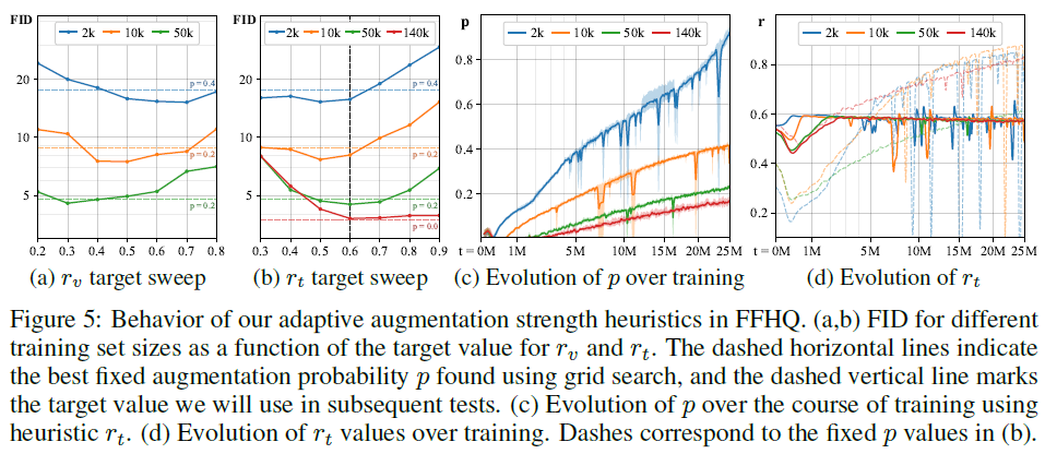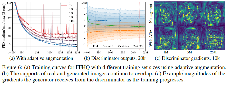 Figure 6. (a) Adaptive augmentation을 사용할 때 Figure 1 (a)와 비교하면 더 좋은 FID 값을 나타낸다.