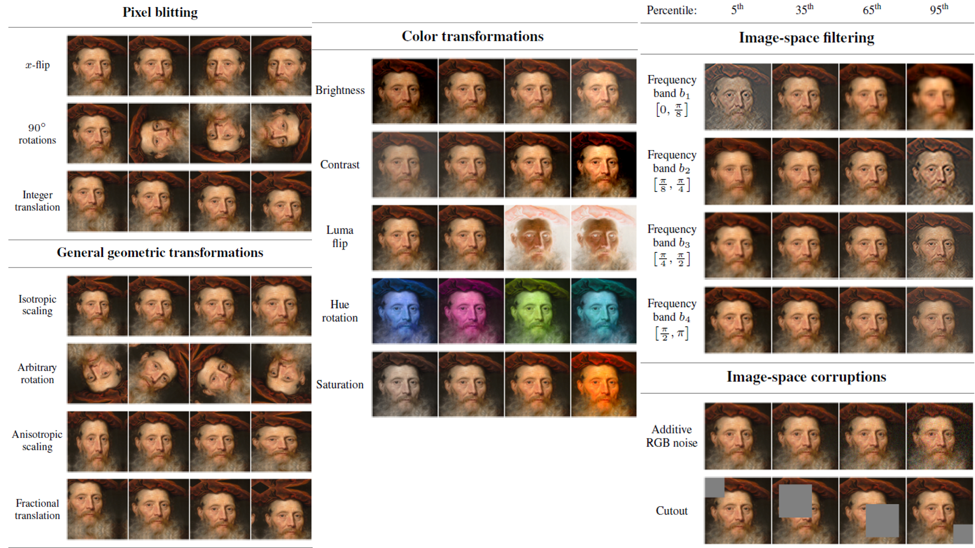 pixel blitting (x-flips, 90도 rotations, integer translation), more general geometric transformations, color transforms, image-space filtering, additive noise, cutout