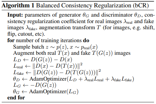 본 논문에서는 bCR에 대한 그림을 도식화해서 Figure 2 (a)에 넣어주었는데 그림과 알고리즘에서 느낄 수 있듯 Generator에서는 Augmentation을 사용하지 않고 Discriminator 훈련에 대해서만 Augmentation을 사용한다. 이후 consistency regularization term에 넣어 loss로 활용한다.