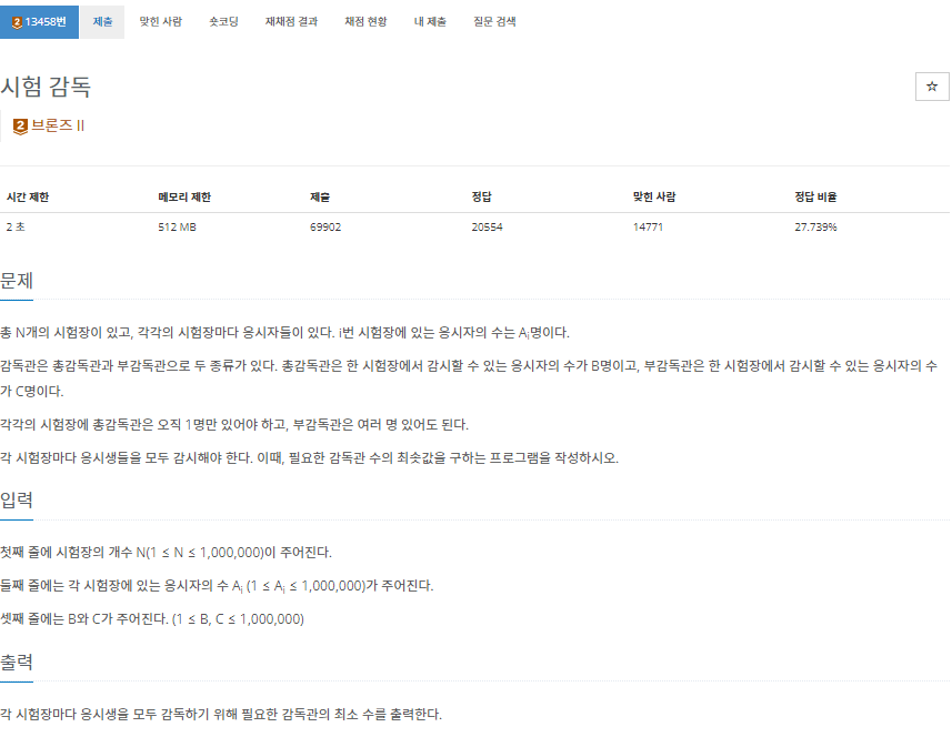 첫째 줄에 시험장의 개수 N(1 ≤ N ≤ 1,000,000)이 주어진다. 둘째 줄에는 각 시험장에 있는 응시자의 수 Ai (1 ≤ Ai ≤ 1,000,000)가 주어진다. 셋째 줄에는 B와 C가 주어진다. (1 ≤ B, C ≤ 1,000,000)