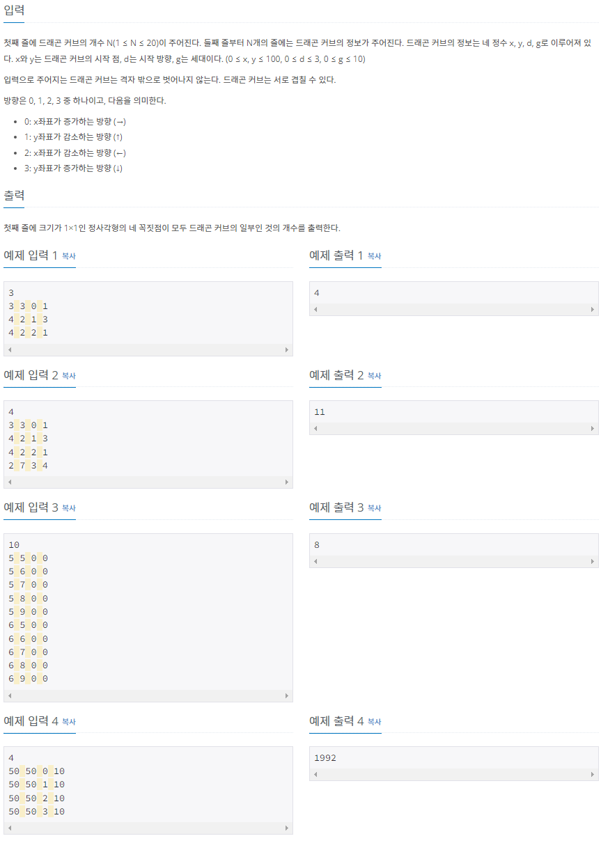 첫째 줄에 드래곤 커브의 개수 N(1 ≤ N ≤ 20)이 주어진다. 둘째 줄부터 N개의 줄에는 드래곤 커브의 정보가 주어진다. 드래곤 커브의 정보는 네 정수 x, y, d, g로 이루어져 있다. x와 y는 드래곤 커