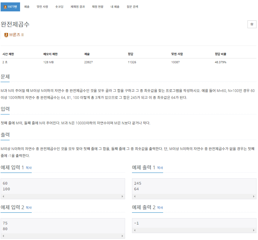 M과 N이 주어질 때 M이상 N이하의 자연수 중 완전제곱수인 것을 모두 골라 그 합을 구하고 그 중 최솟값을 찾는 프로그램을 작성하시오. 예를 들어 M=60, N=100인 경우 60이상 100이하의 자연수 중 완