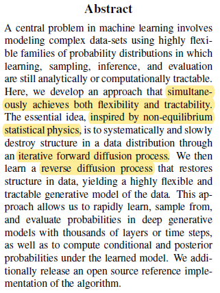 non-equilibrium statistic physics에서 영감을 얻어 flexibility와 tractability를 동시에 만족하는 생성 모델을 새롭게 제안한다.