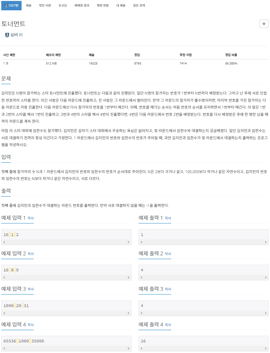 김지민은 N명이 참가하는 스타 토너먼트에 진출했다. 토너먼트는 다음과 같이 진행된다. 일단 N명의 참가자는 번호가 1번부터 N번까지 배정받는다. 그러고 난 후에 서로 인접한 번호끼리 스타를