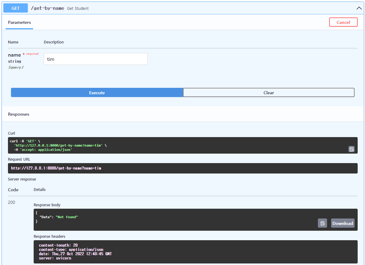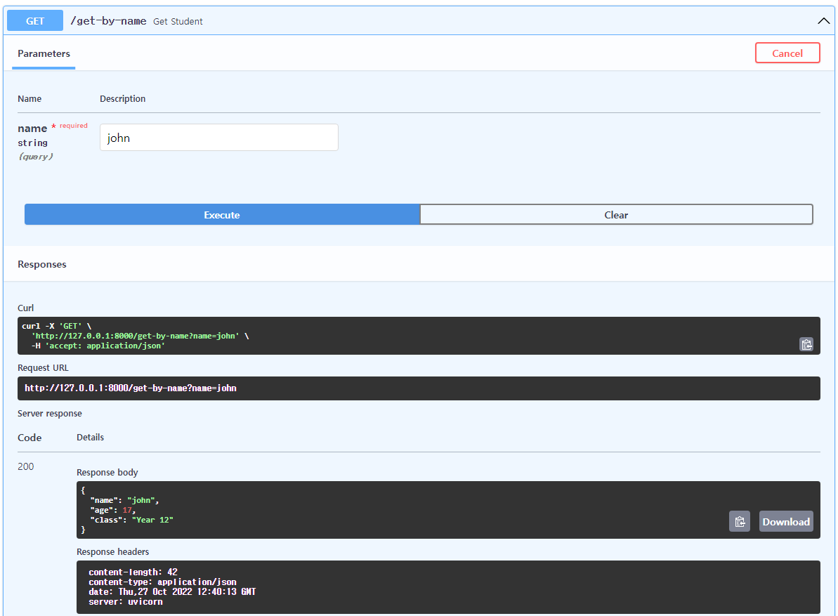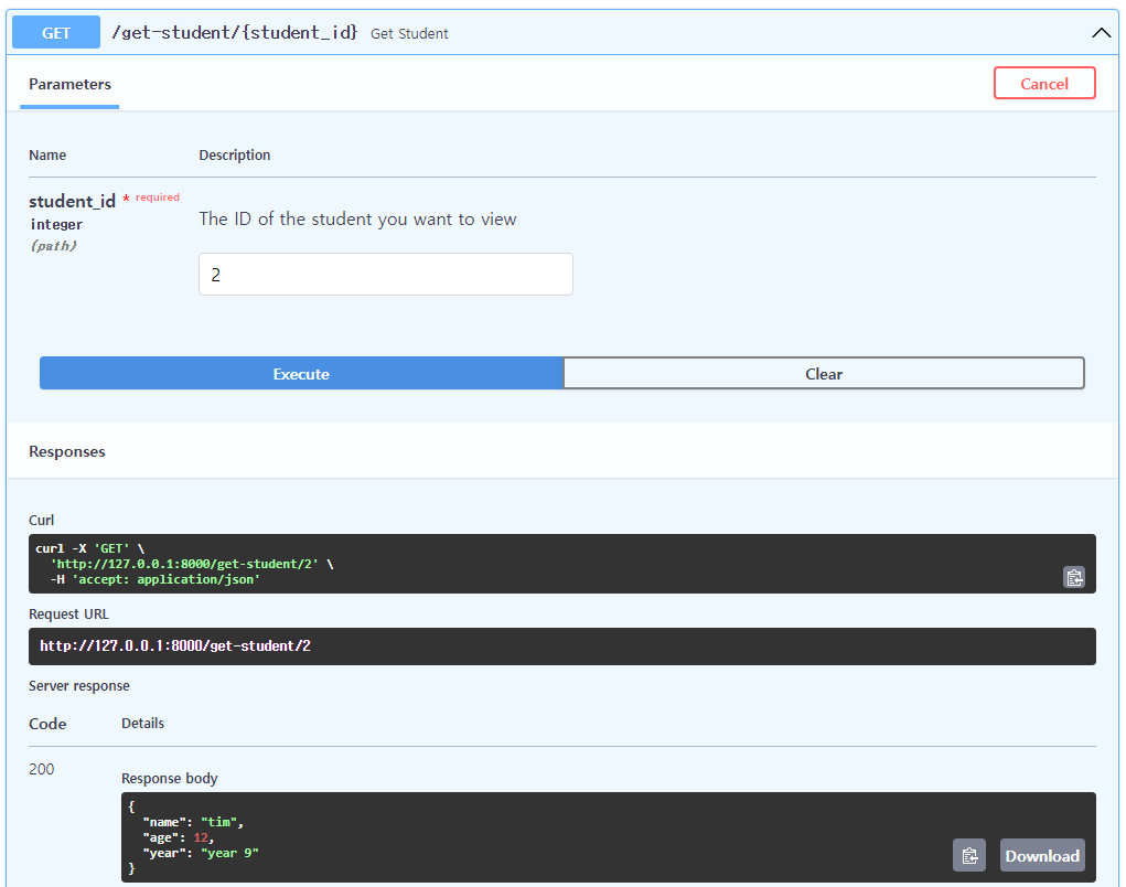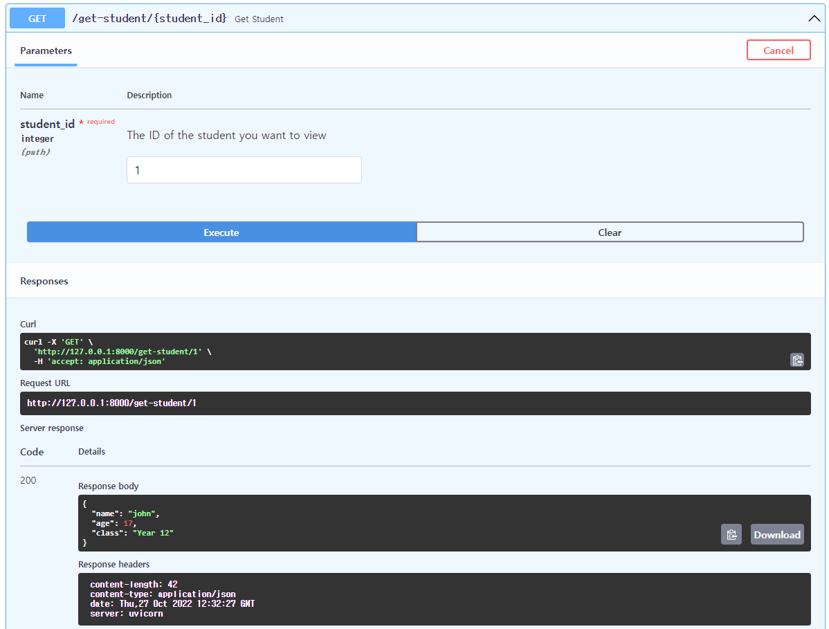 GET /get-student/{student_id}에서 "Try it out" 클릭 후 student_id에 값을 넣음