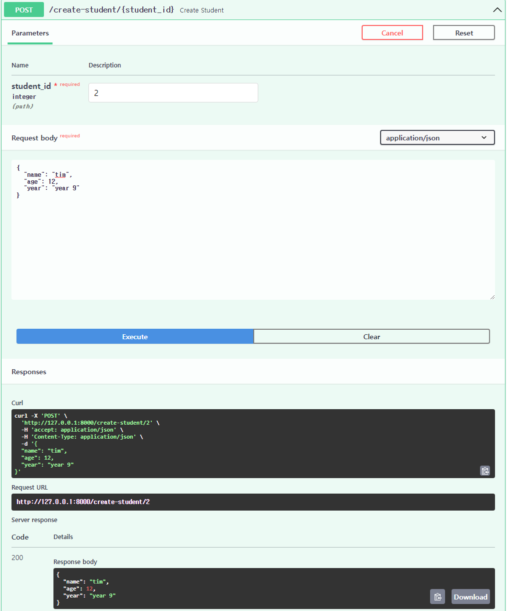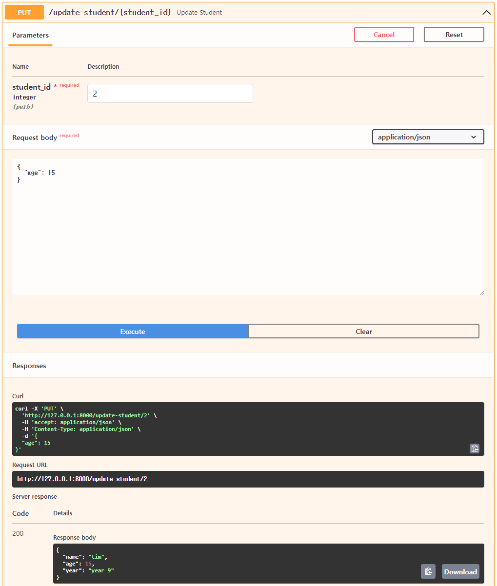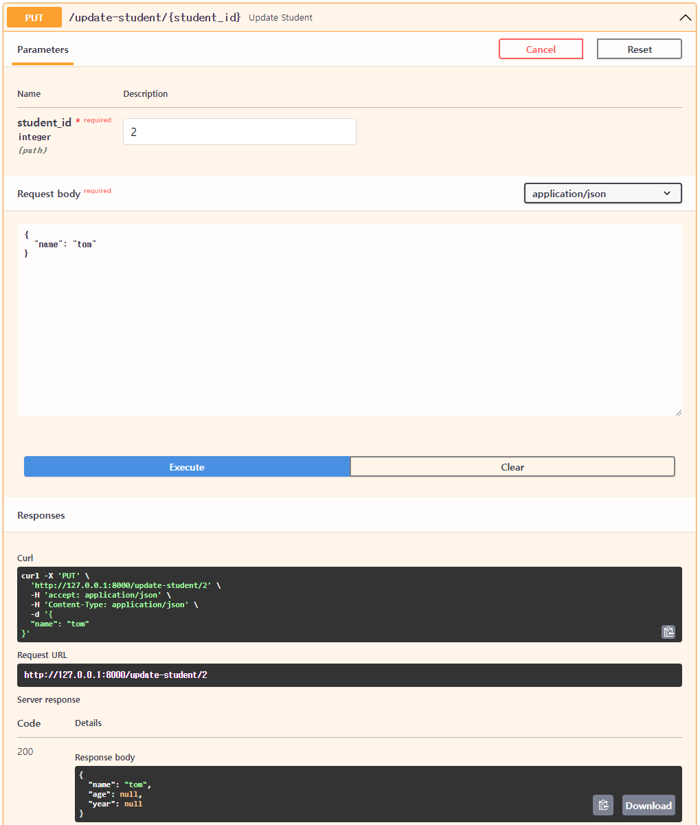 student_id를 새로 넣고 Request body를 채운 다음 Execute 진행