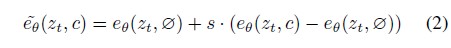 보통 conditioning $\e_\theta (z_t, c)$를 가깝게 하고 unconditioning $\e_\theta (z_t, \varnothing)$을 멀리하도록 수식이 주어진다.