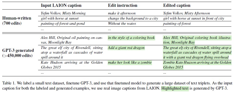 Figure 2 (a)에서 보이듯 Input Caption이 제공되었을 때 Instruction과 Edited Caption을 만들기 위해서 GPT-3를 finetuning하여 훈련시킨다.