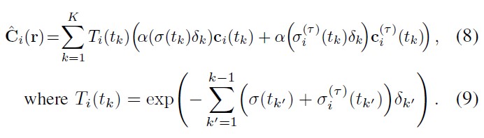 eq 6 volume rendering 식에서 기존 static density, radiance에 transient density, radiance 를 추가하여 새로운 식 구성