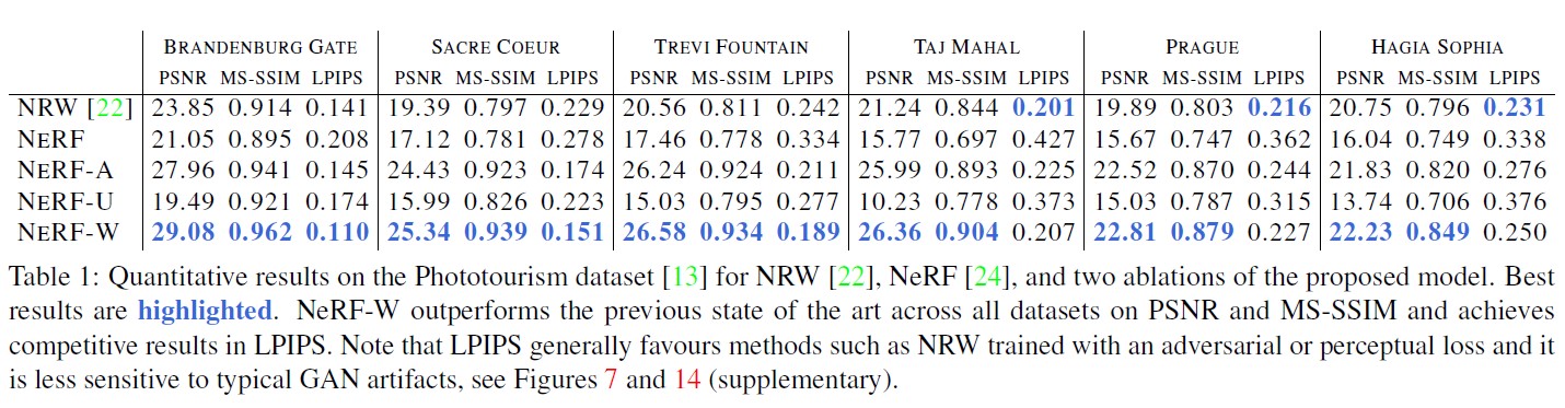 이 문제를 다루기 위해 엄격한 일관성 가정을 완화할 수 있는 NeRF의 확장 모델인 NeRF-W를 제시한다.