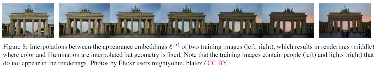 Appearance Embedding Interpolation NeRF-W captures lighting and photometric post-processing in a low-dimensional latent embedding space. Interpolating between two embeddings smoothly captures variation in appearance without affecting 3D geometry. Sorry, yo