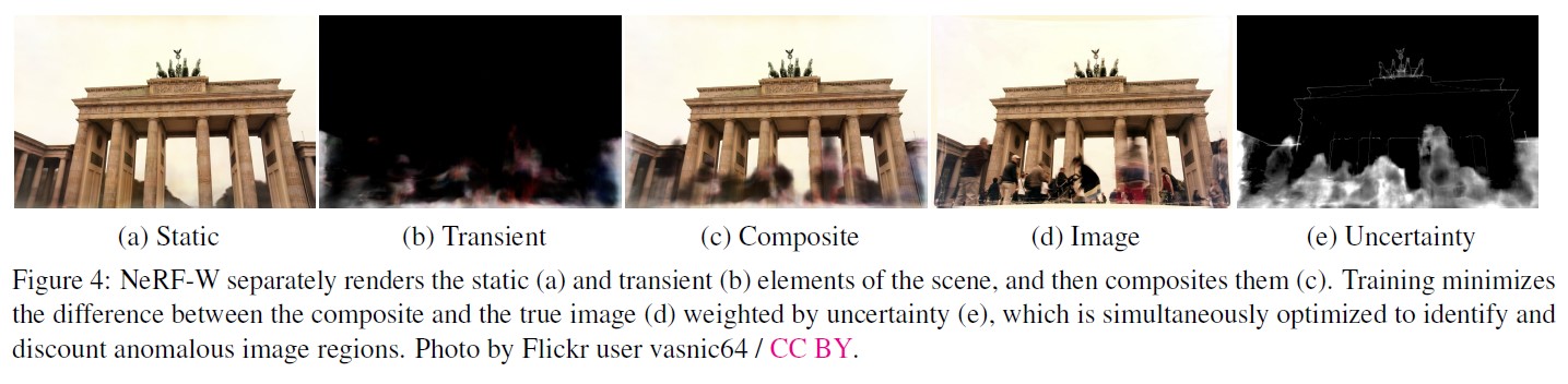 2가지 모델 component는 NeRF-W로 하여금 static과 transient 현상을 분리하도록 만들어준다.