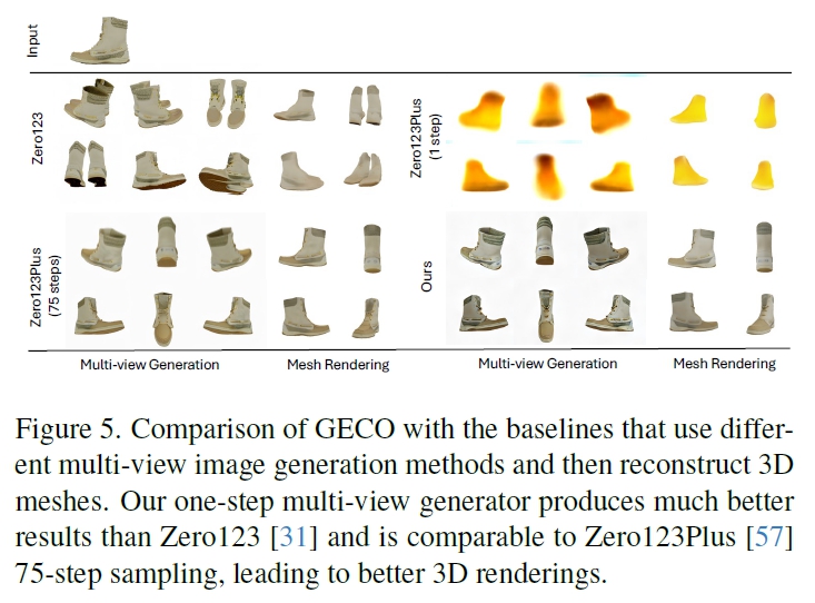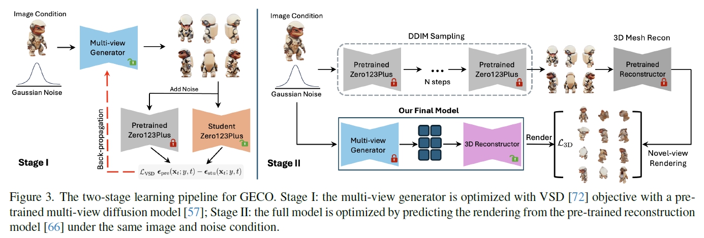 이 문제에서 회피하기 위해 GECO는 Zero123Plus와 같은 pretrained multi-view diffusion model을 teacher model로 사용해, multi-view image를 중간 표현으로 먼저 학습.