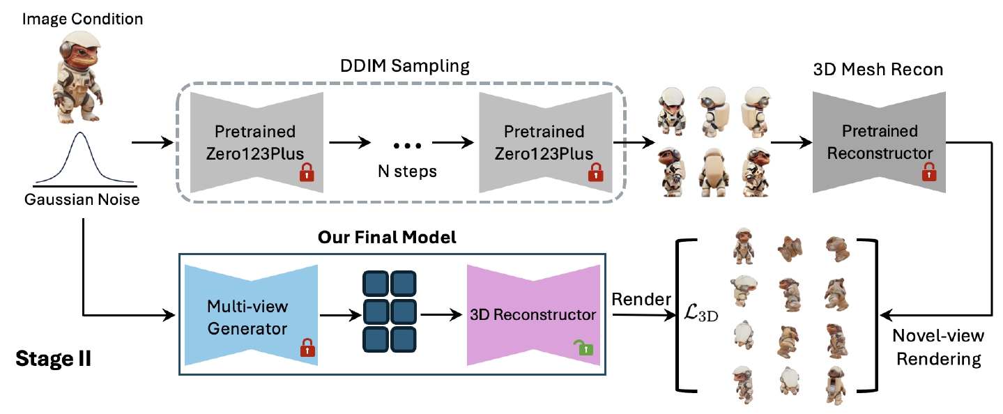Stage 1에서 만든 one-step multi view generator와 3D Reconstructor 통과 (Fig 3 아랫 줄)