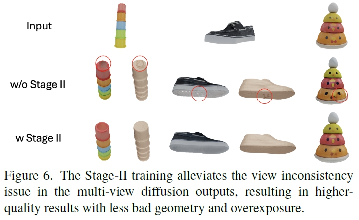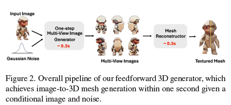 • We propose a two-stage distillation method that efficiently distills a pre-trained multi-view diffusion model and a reconstruction-based model into a feed-forward image-to-3D generation model.