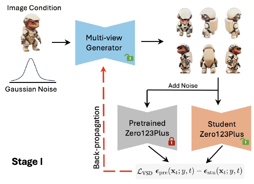 Stage 1 : 단일 이미지 + random noise $z$가 주어졌을 때, Single-Step Generator(Fig 3. Student Zero123Plus)를 학습시켜 3D representation.